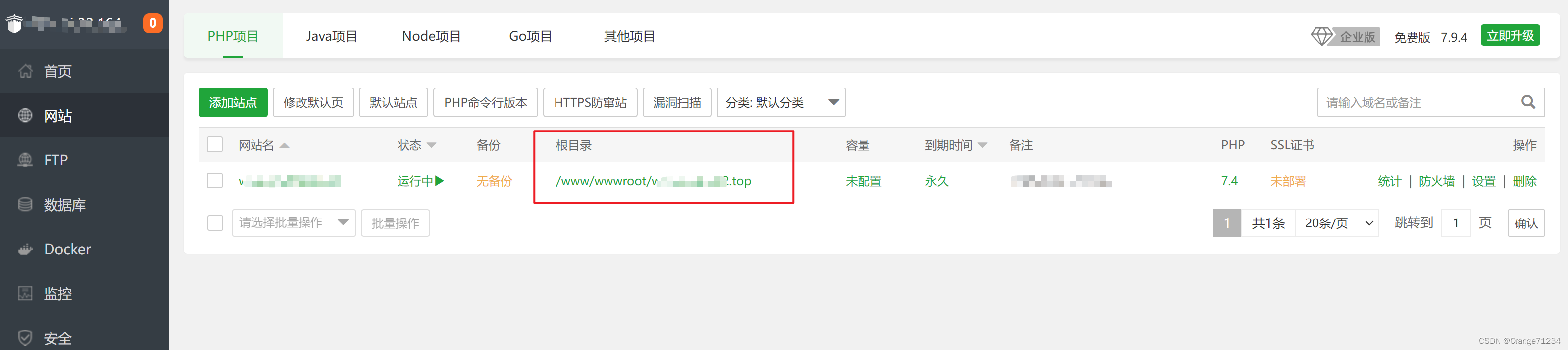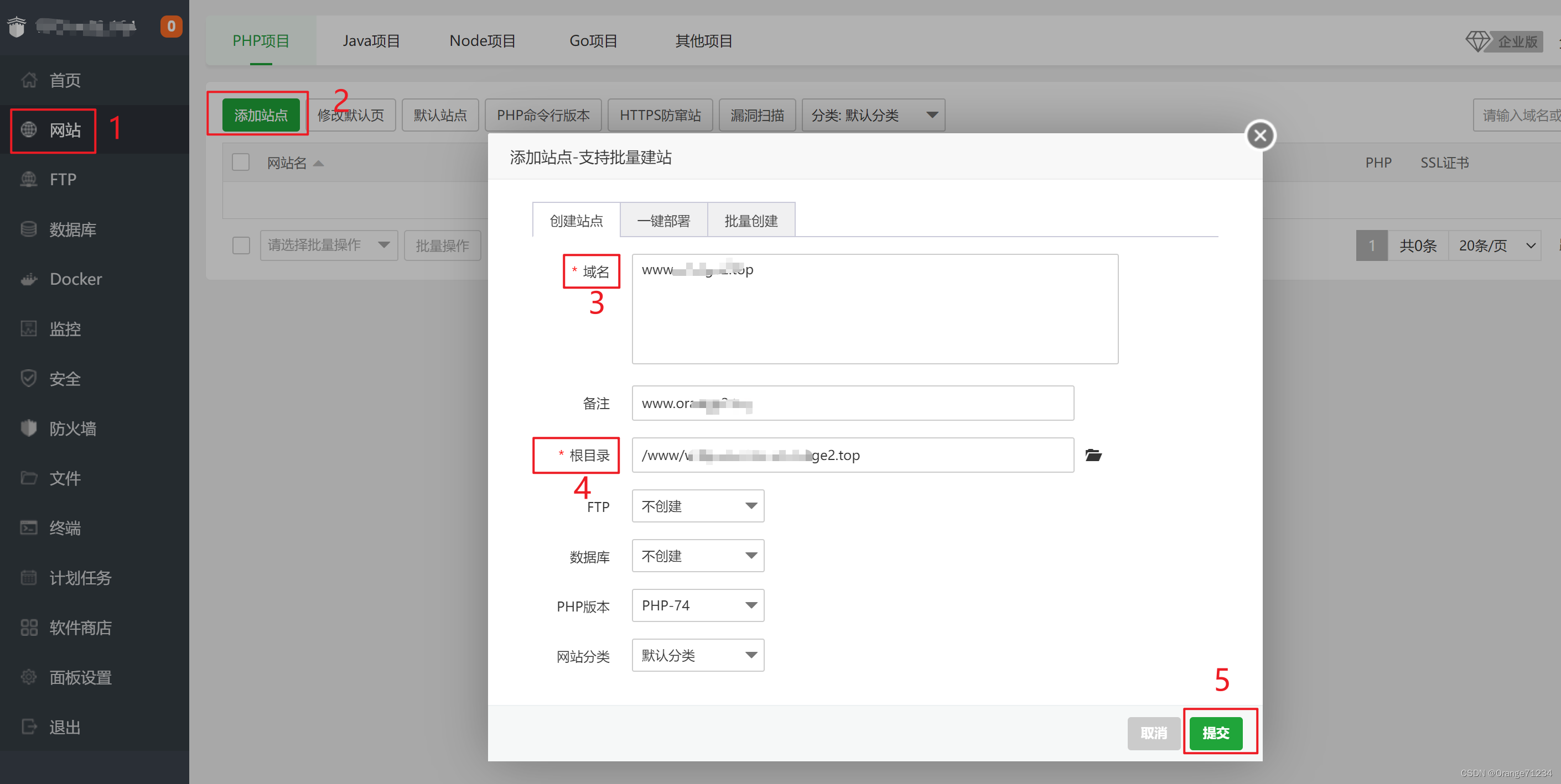 (5)输入用户名密码登录出现如下页面 ,点击左侧网站-->添加站点-->输入域名-->根目录地址会 自动生成-->点击提交-->站点创建成功