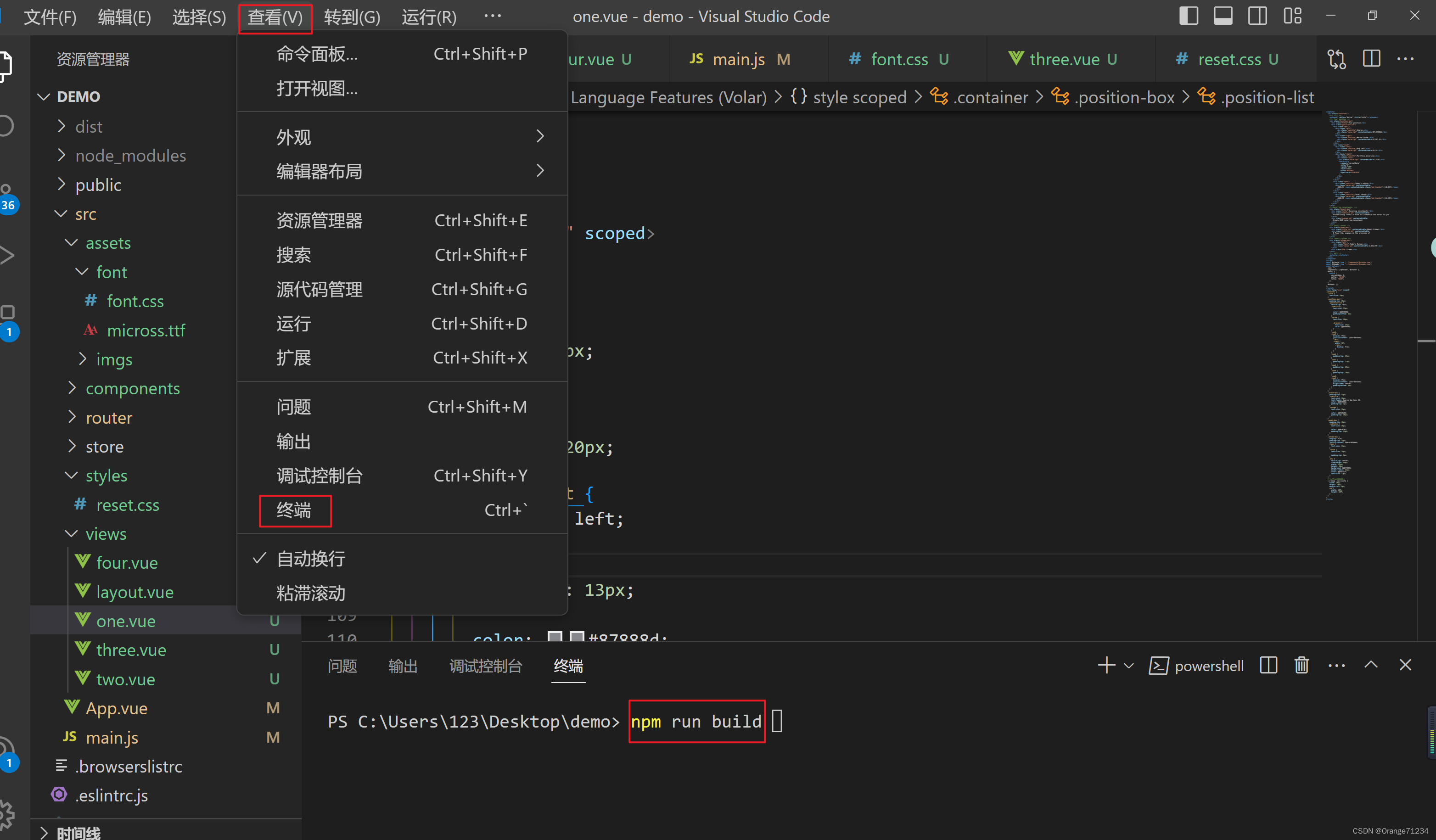 1.vscode打开你的vue项目-- >点终端 -- >输入npm run build 按回车进行打包;
