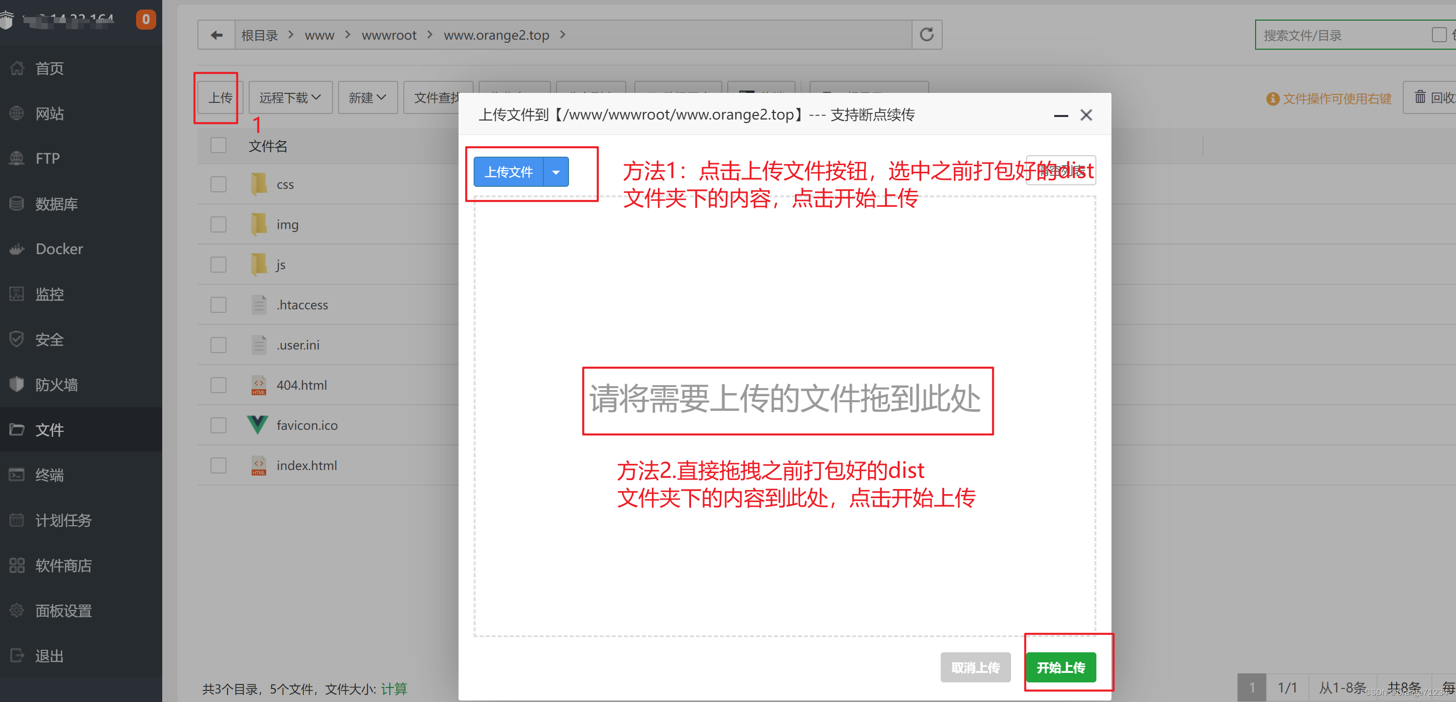 (7)点击上传,按照下图方式上传之前打包好的dist文件夹下的内容,