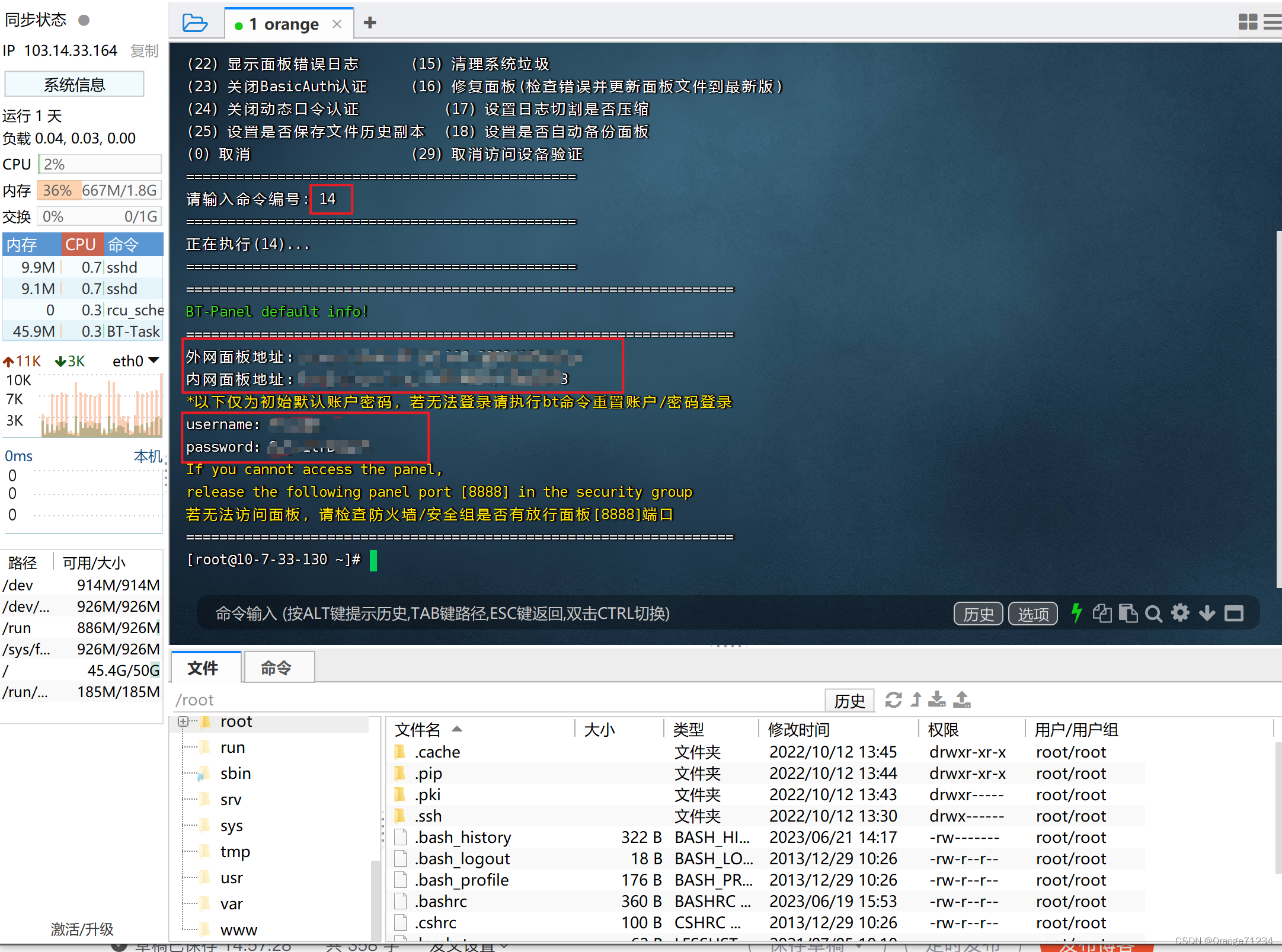 (3)输入14,查看并复制外网面板地址以及用户名,密码
