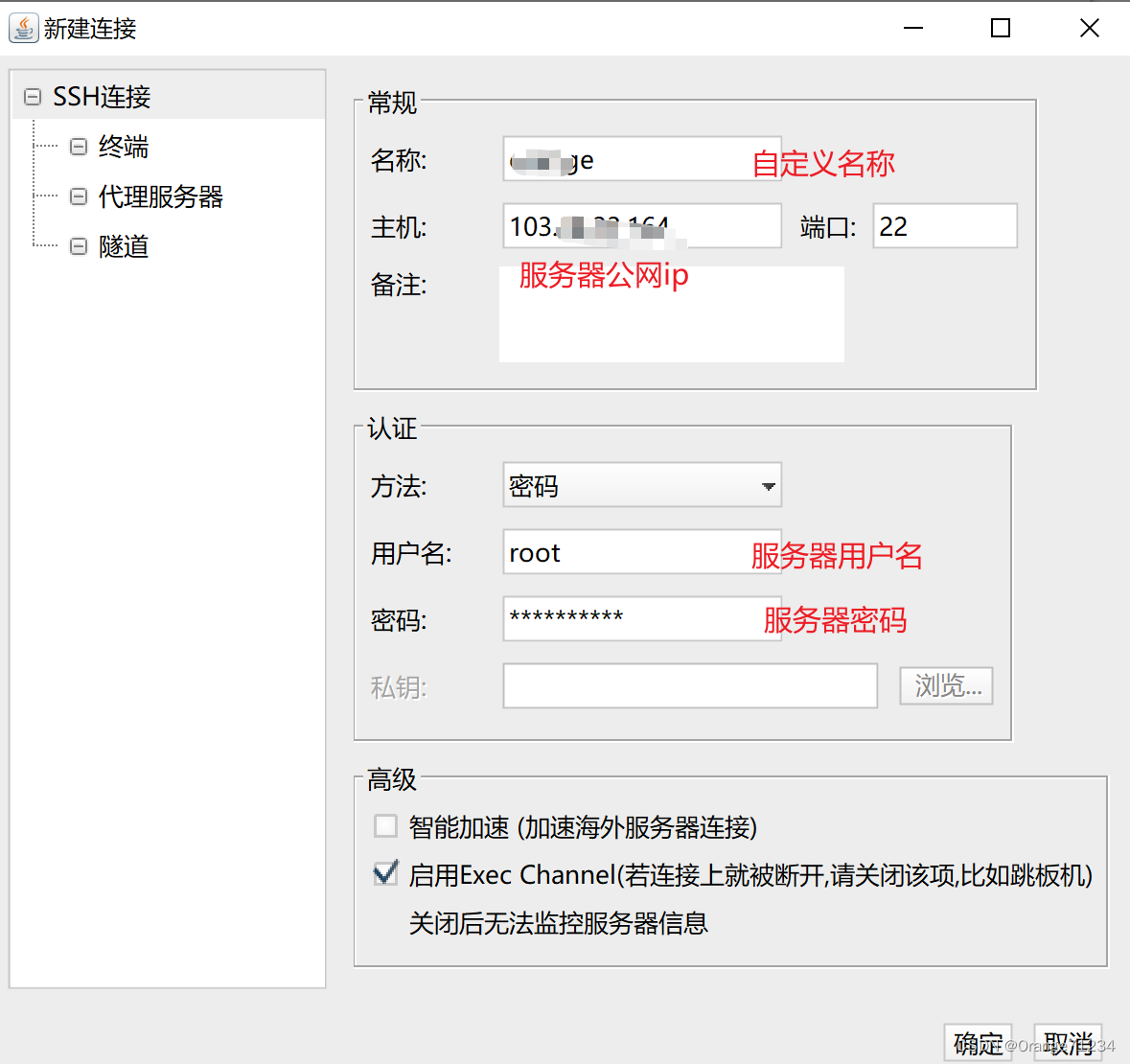 3.下载安装好软件后双击打开,选择SSH连接,填写如下信息,最后点击确定