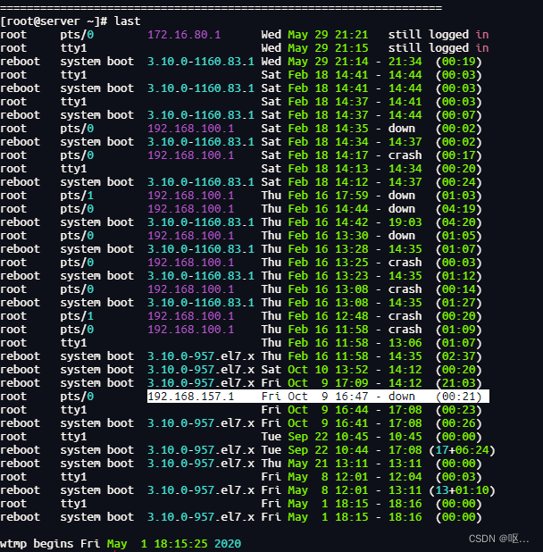 它用于显示在 btmp 文件中记录的失败登录尝试。btmp 文件记录了系统上所有的失败登录尝试