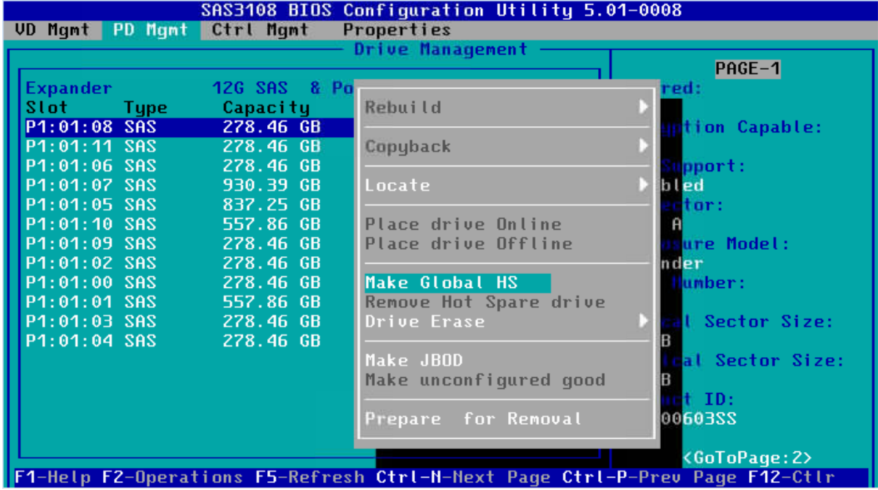 按“Ctrl+N”切换到“PD Mgmt”页签。选中待设置的硬盘。按“F2”,在弹出的菜单中选择“Make Global HS”