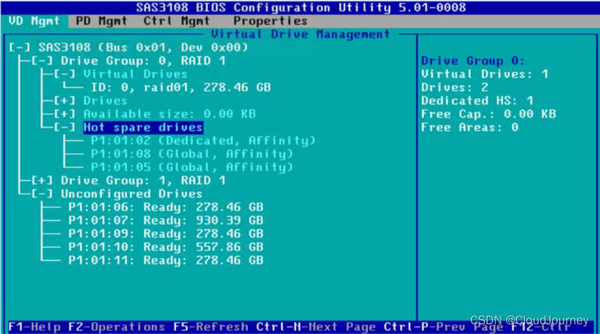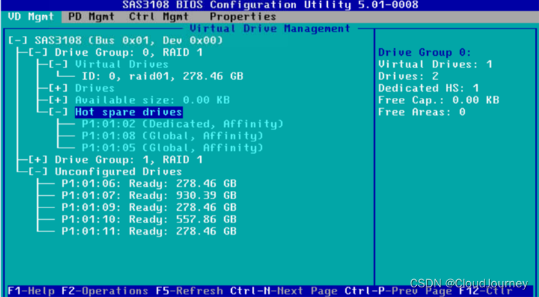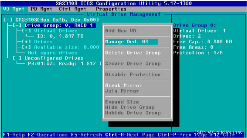 在“VD Mgmt”页签中选中要配置局部热备盘的RAID组。按“F2”,在弹出的菜单中选择“Manage Ded. HS”