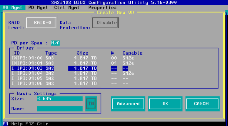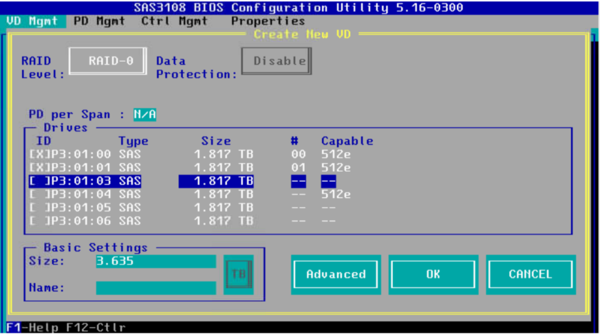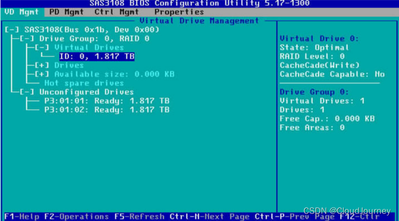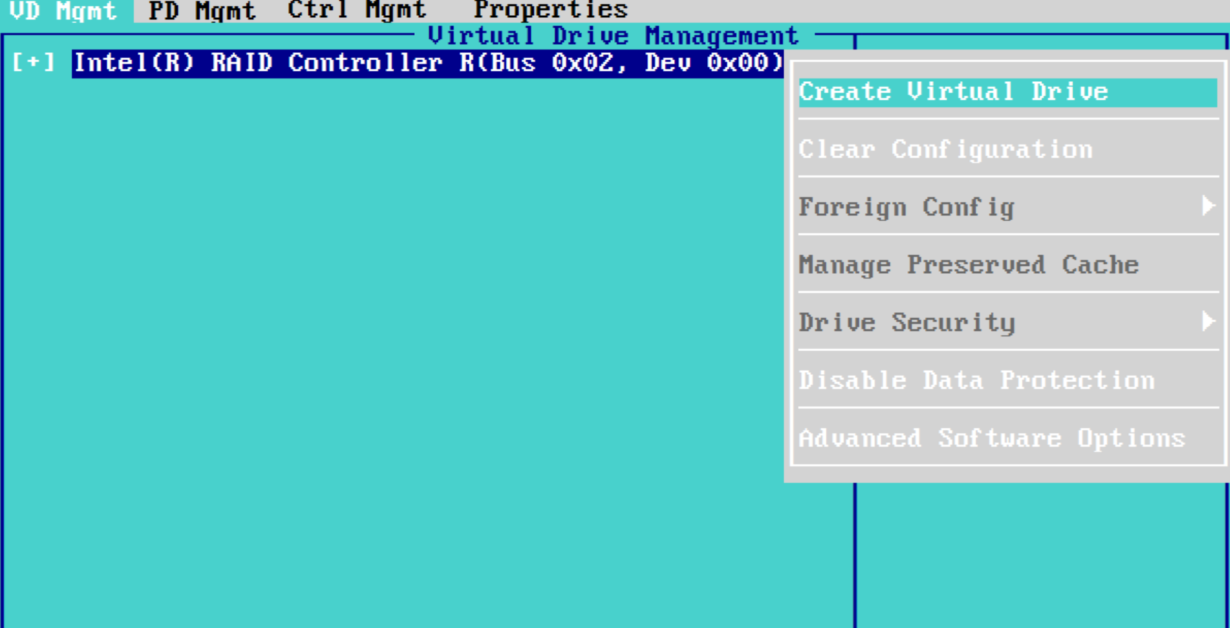 进入“Create Virtual Drive”界面。按“Ctrl+P”或“Ctrl+N”切换到“VD Mgmt”页签。 按“↑”、“↓”将光标移至“SAS3108 (Bus 0x01, Dev 0x00)”。后按“F2”,在弹出的列表中选择“Create Virtual Drive”,按“Enter”。