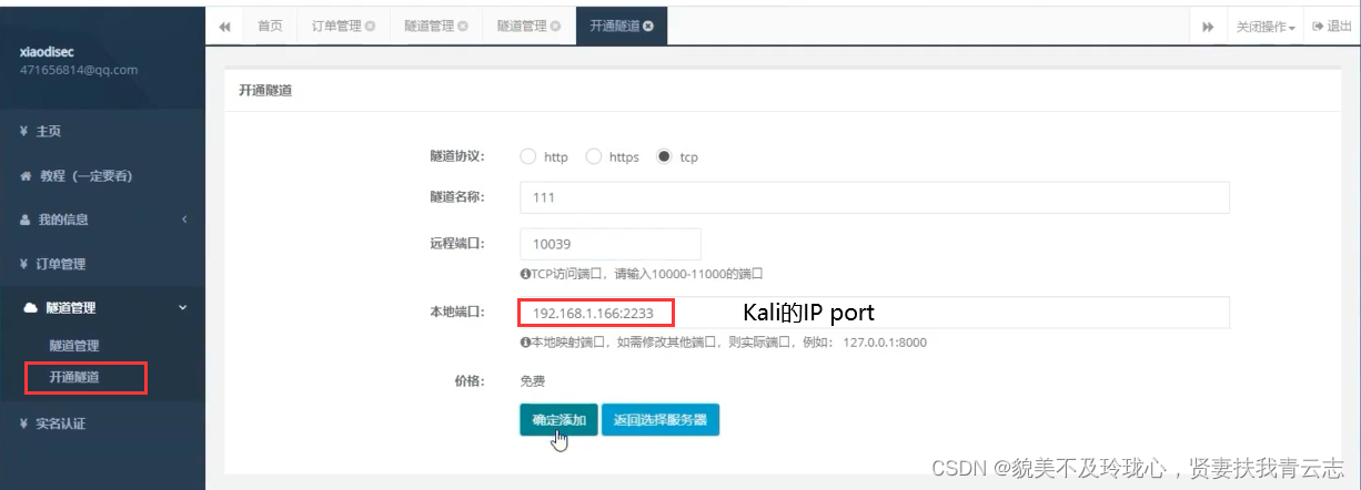 开通隧道,设置Kali内网IP,Port,以及服务器开放的端口