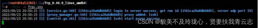 [common] server_addr = 47.94.236.117 server_port = 7000 [msf] type=tcp local_ip=127.0.0.1 local_port=5555 remote_port=6000 启动客户端