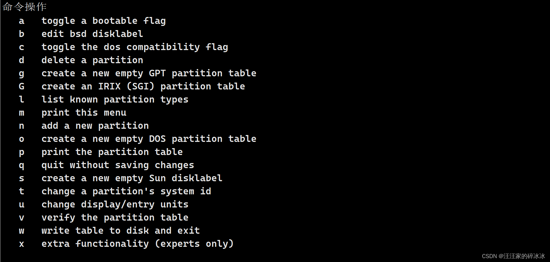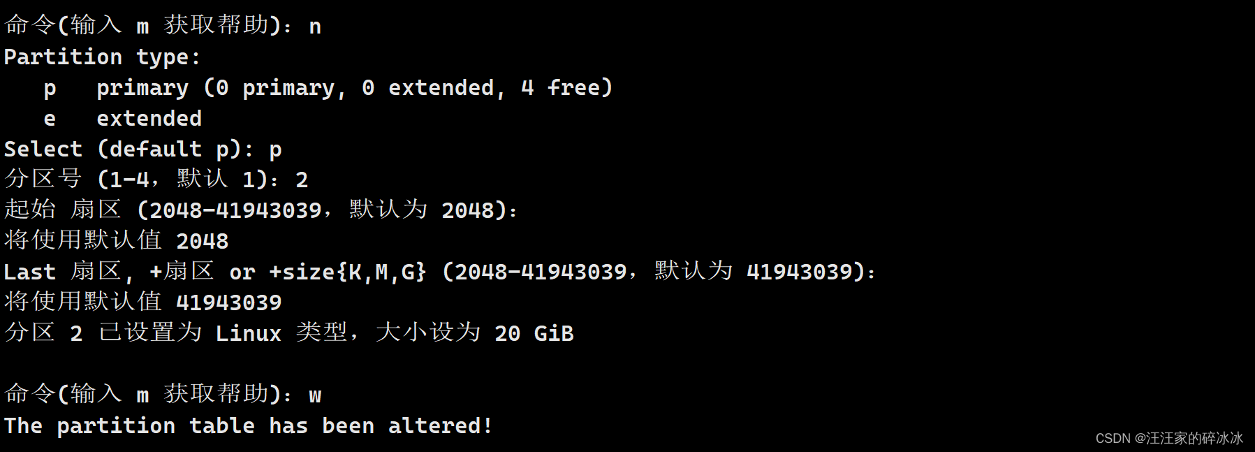 我们这边需要添加新分区,所以我们输入"n",然后在出现的选项我们选择普通分区、e应该是扩展逻辑分区(有知道的可以补充),然后根据需要输入起始扇区、默认扇区,这边就跟Windows分区时的操作差不多。之后我们需要输入 "w",将我们定义的配置写入到磁盘,配置才会生效。