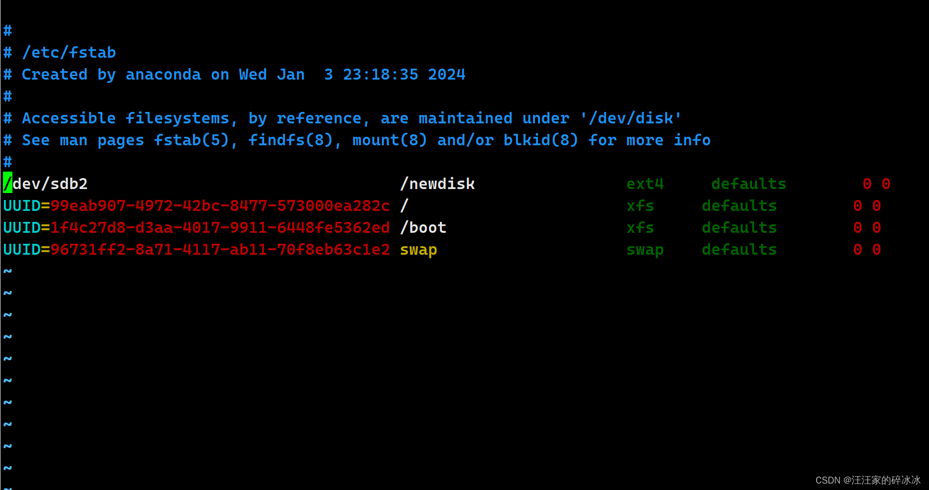/dev/sdb2 /newdisk ext4 defaults 0 0