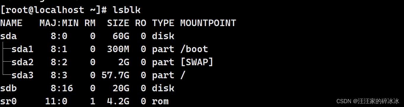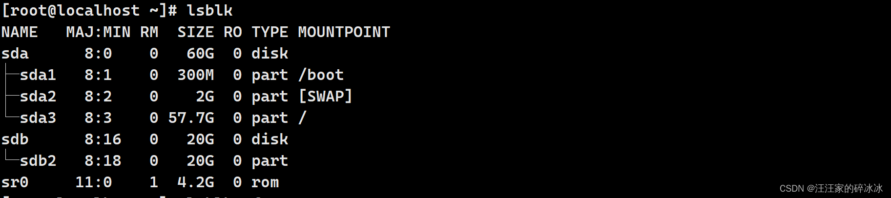 运行结束之后,我们再次运行命令lsblk查看磁盘分区情况