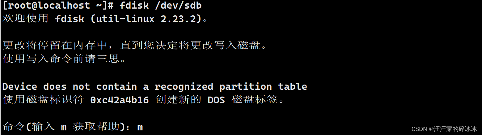 我们使用命令 fdisk /dev/sdb 进入到以下界面创建新的分区,需要注意的是标红部分需要根据实际情况输入。