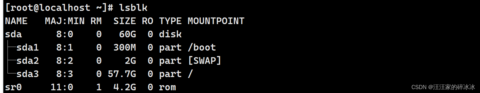 这里我们可以看到该服务器上已经挂载了一块硬盘 sda 并且,分为 sda1、sda2、sda3三个分区,分别挂载于/boot(引导分区)、swap(交换分区)、/ (主分区)