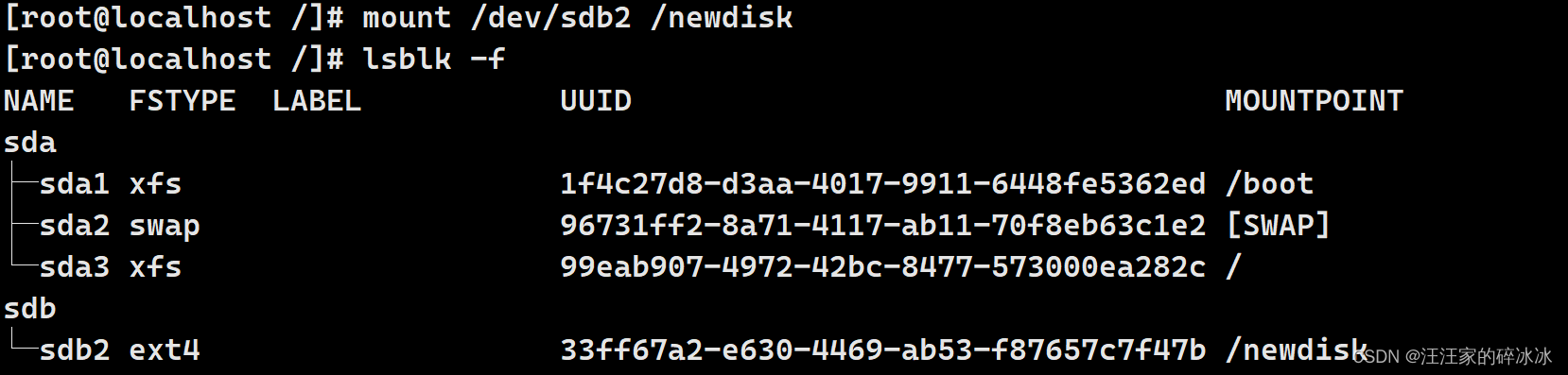 这里我们使用命令 mount /dev/sdb2 /newdisk 进行挂载到对应目录。