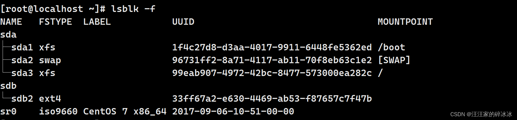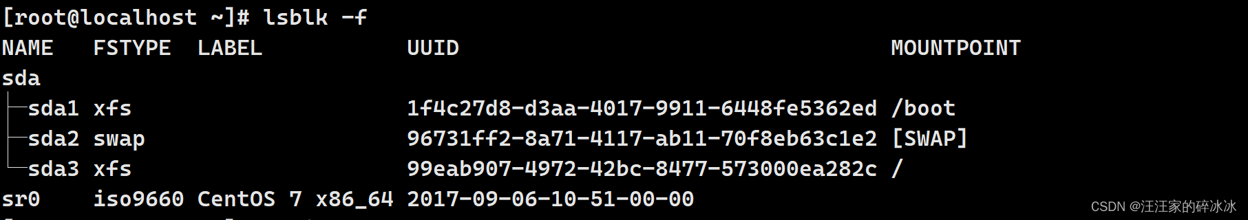 2、接着我们可以查看该服务器的挂载分区的UUID信息,使用命令 lsblk -f 查看,结果如下: