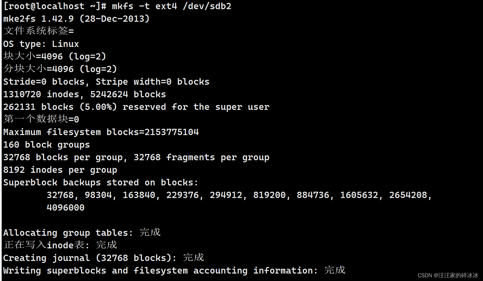 接下来,我们来使用命令 mkfs -t ext4 /dev/sdb2 进行格式化,然后我们便可以看到sdb2已经有了UUID信息,但是目前该分区还没有被挂载到对应的目录;