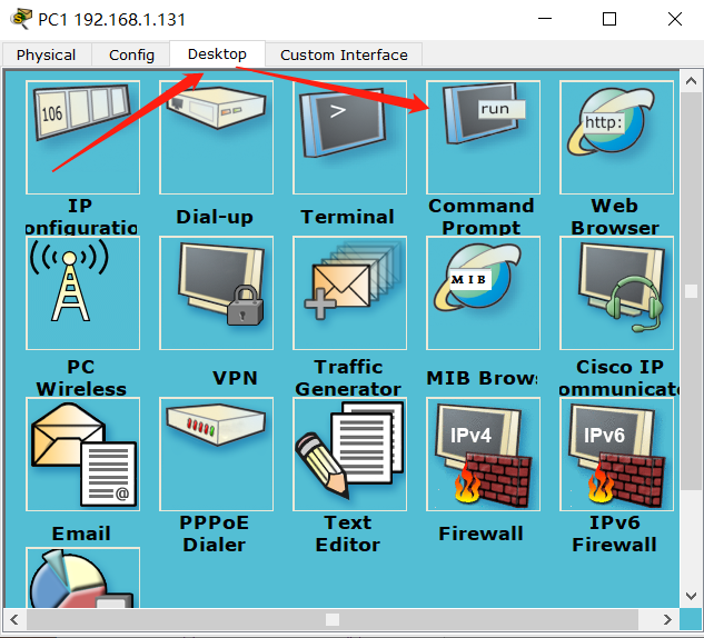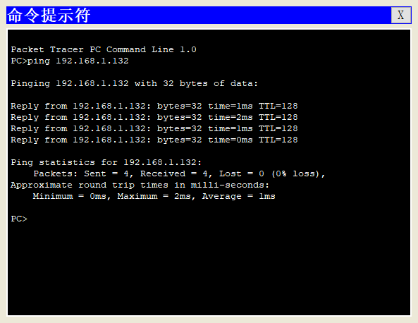点击任一一台主机选择Desktop---CommandPrompt使用ping命令测试与其他主机的通信。