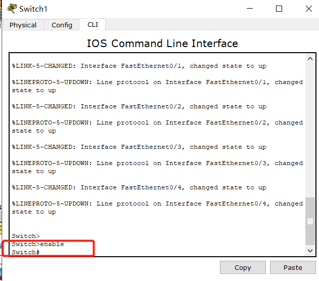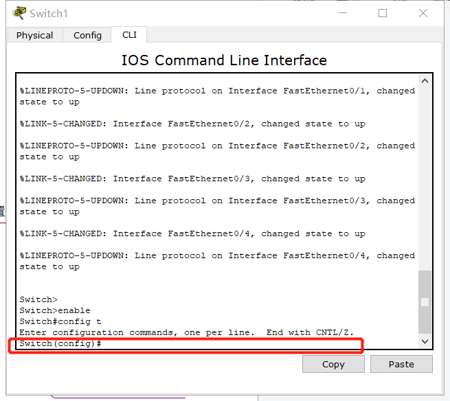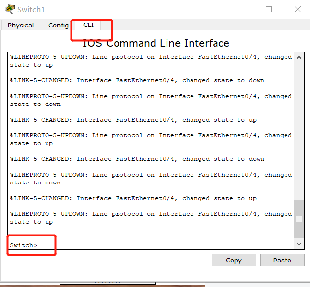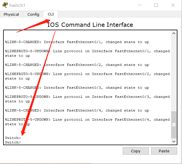 和刚刚查看MAC地址表一样的位置,点击CLI先回车几下直到出现Switch>提示符开始输入命令,注意这里只识别英文输入法,请切换英文输入法输入命令。