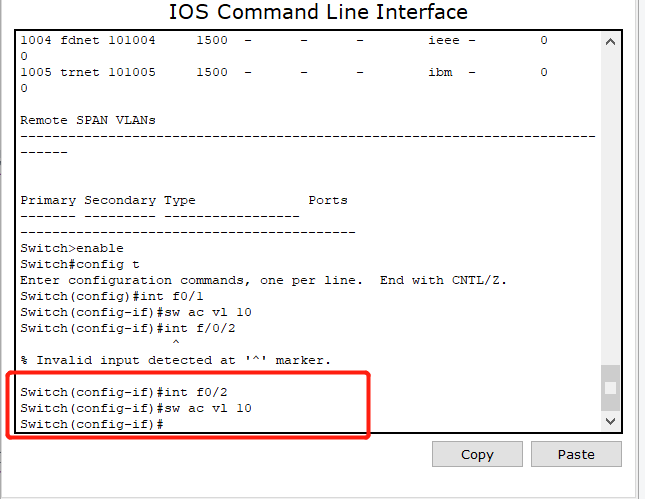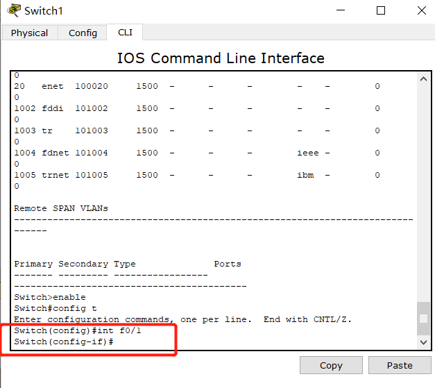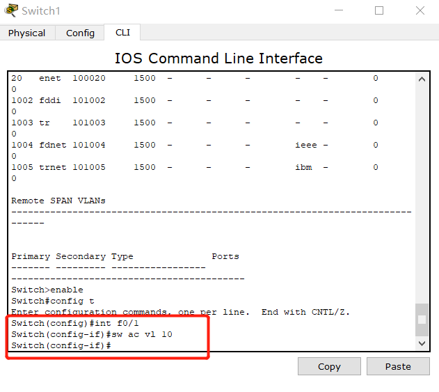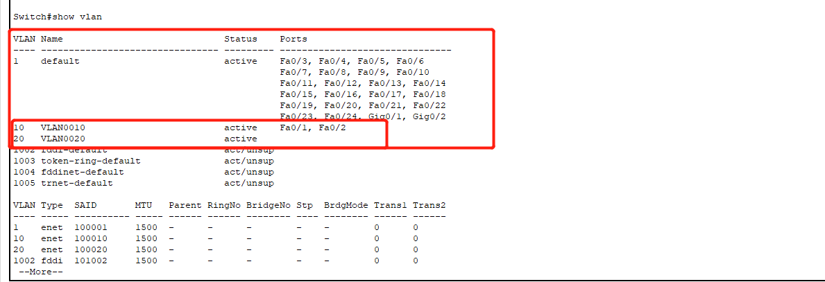 上图可以看到vlan 10的成员接口有Fa0/1,和Fa0/2,并且可以发现默认所有接口都是在vlan 1局域网中的,1号局域网是默认被占用的。
