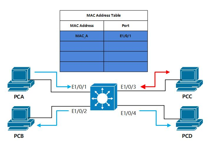- 如上图所示,PCA放信息是要给PCC的,所以找到PCC的MAC地址后,交换机会学习PCC的MAC地址到MAC地址表中记录下来。
