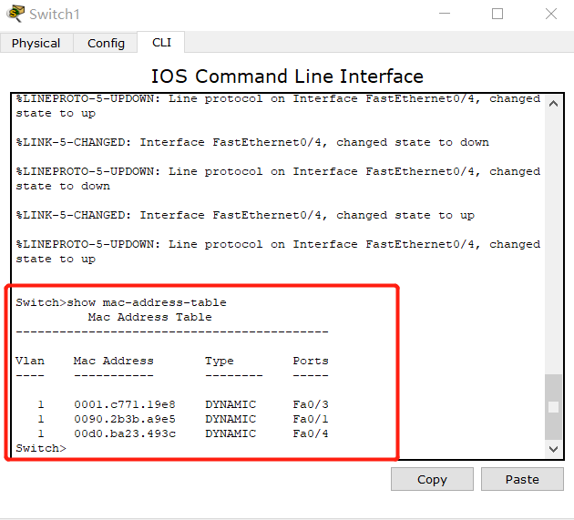 通过点击交换机的CLI然后回车出现switch>,输入show mac-address-table命令查看MAC地址表。