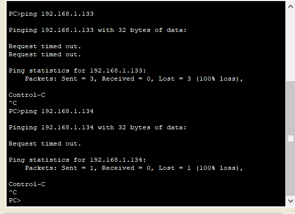 上图所示ping3号和4号接口主机超时,不能通信了,隔离成功,这就是划分局域网的好处可以隔离不同部门之间的联系,不同部门不可以互相访问主机。