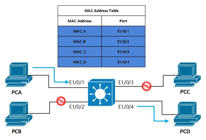 如上图所示,当交换机记录了四台电脑的MAC地址后,就可以准确的将信息传送到对应的主机,其他主机不做任何反应。