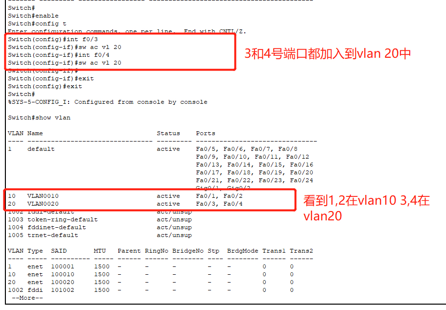将3和4号接口使用一样的放法加入到vlan 20局域网中