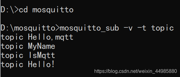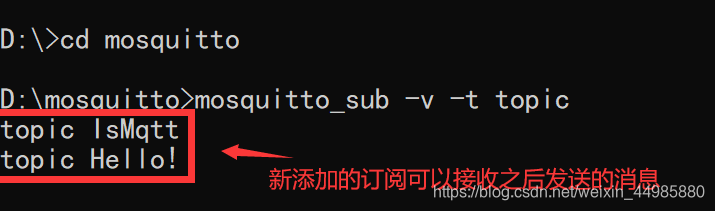 我们知道MQTT协议中的消息订阅者可以存在多个,所以我们可以在新的cmd命令行中继续订阅该发布者的topic主题消息,之后我们再通过发布者发布,在另一个订阅者中就可以接收到发布者之后发送的消息了!