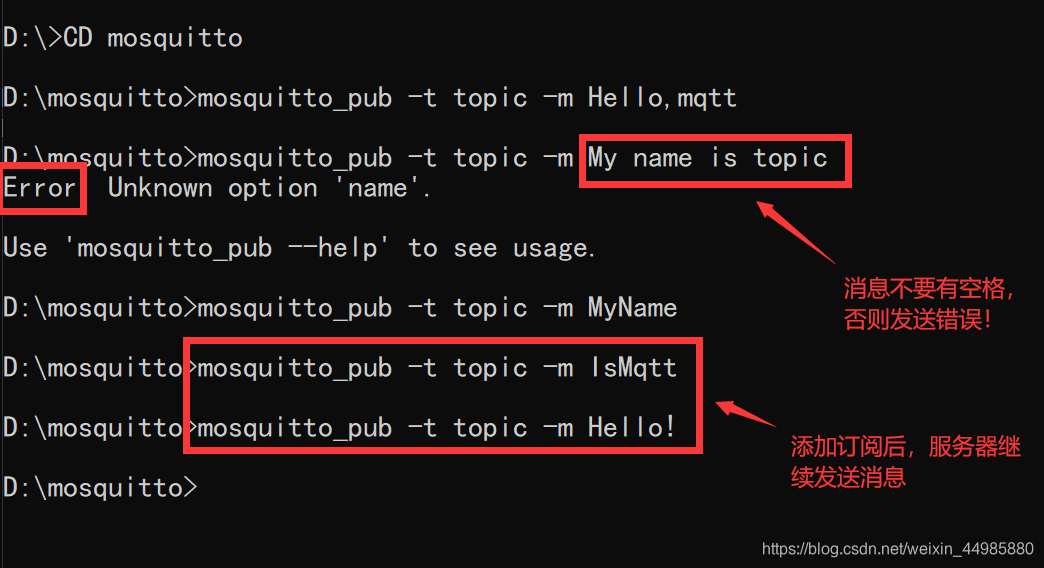 其中的“topic”为发布的消息的主题,和上面订阅者订阅的主题是同一个概念,第二个大括号中的内容为将要发布的消息,在这里要注意的是,在使用cmd命令行发布消息时,消息中间不应该有空格,否则会发送失败!