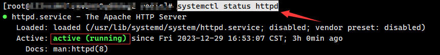 这个状态表示httpd(Apache程序)正常运行,就跳到第2步,如果是failed,就输入systemctl start httpd,启动程序,再检查是否正常
