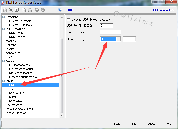 5、点击左侧Input>UDP修改Date encoding的值为Utf-8防止部分带有汉字的日志为乱码