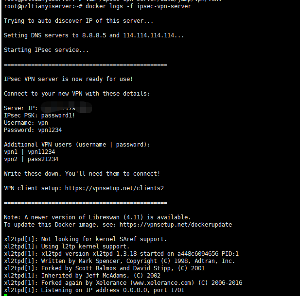 VPN_IPSEC_PSK=password1! # 配置用于登陆VPN的账号和密码 VPN_USER=vpn VPN_PASSWORD=vpn1234 # 如下应该填写本机的外网IP(服务器ip) VPN_PUBLIC_IP=36.111.179.* # 配置额外的用户名和密码 VPN_ADDL_USERS=vpn1 vpn2 VPN_ADDL_PASSWORDS=vpn11234 pass21234 #DNS配置 VPN_DNS_SRV1=8.8.8.5 VPN_DNS_SRV2=114.114.114.114 docker run \ --name ipsec-vpn-server \ --env-file /data/jump/vpn/.env \ --restart=always \ -p 500:500/udp \ -p 4500:4500/udp \ -v /lib/modules:/lib/modules:ro \ -d --privileged \ hwdsl2/ipsec-vpn-server 在上述命令中,我们使用了hwdsl2/ipsec-vpn-server这个Docker镜像,并且指定在vpn.env文件中设置环境变量。其中,我们将UDP端口号500和4500分别映射到主机的对应端口,让客户端能够与VPN服务器建立隧道。