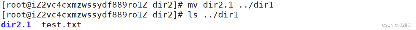 ▶ mv dir2.1 ../dir1 将dir2中的 dir2.1目录剪切到dir1目录下;