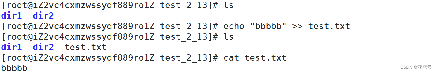 ▶ echo "bbbbb" >> test.txt 利用追加重定向在文件中输出内容,若该文件不存在则会自动创建。