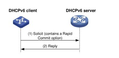 (1) DHCPv6客户端在发送的Solicit消息中携带Rapid Commit选项,标识客户端希望服务器能够快速为其分配地址/前缀和网络配置参数 (2) 如果DHCPv6服务器支持快速分配过程,则直接返回Reply消息,为客户端分配IPv6地址/前缀和其他网络配置参数。如果DHCPv6服务器不支持快速分配过程,则采用交互四个消息的分配过程为客户端分配IPv6地址/前缀和其他网络配置参数 | ![]() |