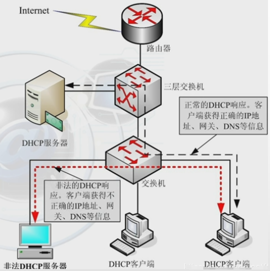 (1).先使用攻击软件,不断向DHCP服务器发出 DHCP Request 报文请求,耗尽DHCP服务器的资源,让客户机不能上网 (2).自己伪造DHCP服务器,并“冒充”为一这个网段中的合法DHCP服务器,向客户端提供DHCP服务,这时候客户端的网关就是伪造的DHCP服务器的地址,攻击者就可以截获流量,并且还可以将数据包正常转发到网络上,不影响客户端的正常通信,只不过客户端上网的流量都在攻击者监控下,并且非法DHCP+攻击程序容易拿到用户信息,比如用户操作系统的账号密码,结果DHCP客户端将从非法DHCP服务器处获得不正确的IP地址、网关、DNS等配置参数 | ![]() |