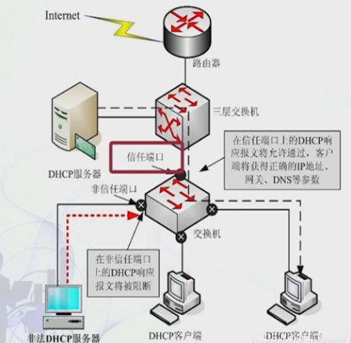 (1).在DHCP服务器上进行IP与MAC地址的绑定: 在通过DHCP服务器进行客户端IP地址等参数分配的网络中,对于一些重要部门的用户,可以通过在DHCP服务器上绑定IP与MAC地址,实现对指定计算机IP地址的安全分配 (2).使用DHCP Snooping信任端口: 能够过滤来自网络中非法DHCP服务器或其他设备的非信任DHCP响应报文.一旦将交换机的某一个端口设置为指向正确DHCP服务器的接入端口,那么交换机会自动丢弃从其他端口上接收到的DHCP响应报文.因为非信任端口,所以非法的DHCP服务器虽然接收到了信息,也发出了响应报文,但是在不信任端口处被阻断了,内网设备就不会得到不信任DHCP发送的响应报文了,就是不管你响应有多快,但是都半路夭折了。 | ![]() |