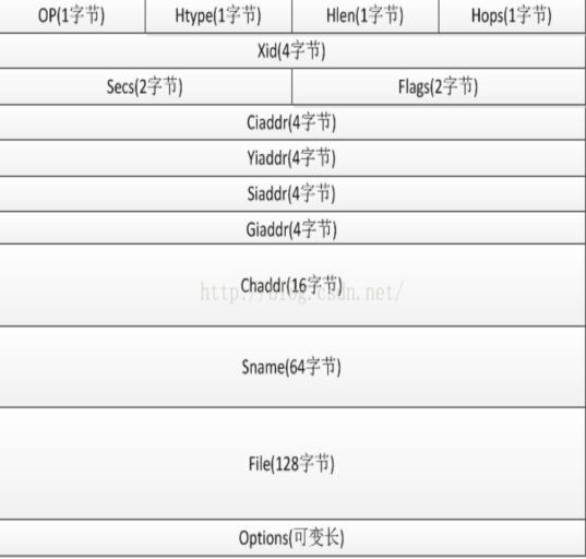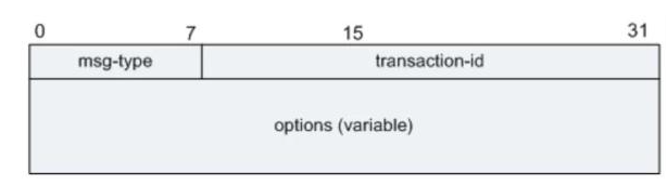 op: 1.client发送给server的封包,设为1 2.server发送给client的封包,设为2 htype: 硬件类别,1表示10Mb/s的以太网(Ethernet)的硬件地址 hlen: 硬件地址长度 hops:跳数,若封包需经过router传送,每站加 1,若在同一网内,为0(客户端初始设置为0) xid:DHCP REQUEST 时随机生成的一段字符串,服务器和客户端用来在它们之间交流请求和响 应,客户端用它对请求和应答进行匹配两个数据包拥有相同的xid说明他们属于同一次会话 seconds: 由客户端填充,表示从客户端开始获得IP地址或IP地址续借后所使用了的秒数 flags: 从0到15共16 bits 最左1Bit为1时表示 server将以广播方式传送封包给client 最左1Bit为0时表示 server将以单播方式传送封包给client ciaddr: 客户端会在发送请求时将自己的ip地址放在此处 yiaddr: 服务器会将想要分配给客户端的ip地址放在此处 siaddr: 一般来说是服务器的ip地址.但是注意:根据openwrt源码给出的注释,当报文的源地址、siaddr、option>server_id字段不一致(有经过跨子网转发)时,通常认为option>srever_id字段为真正的服务器ip,siaddr有可能是多次路由跳转中的某一个路由的ip giaddr: 如果需要跨子网进行DHCP地址发放,则在此处填入经过的路由器的ip地址 sname: 服务器主域名 file: 启动文件名,是一个空结尾的字符串。 options: 可以自由添加的部分,用于存放客户端向服务器请求信息和服务器的应答信息 | ![]() |