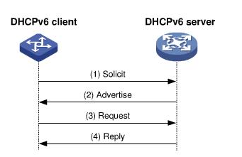 使用4个消息包的完整交互 (DHCP for IPv4使用Discover/Offer/Request/Acknowledge (DORA), DHCPv6使用Solicit/Advertise/Request/Reply (SARR))