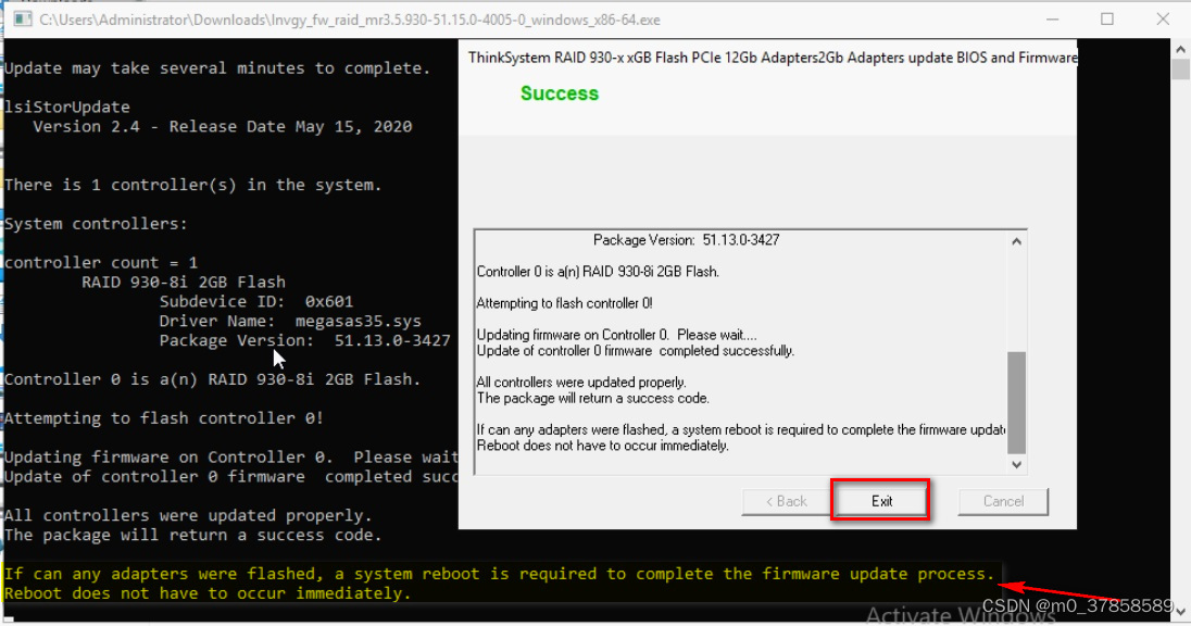 6. 单击“退出” ,然后重新启动服务器以完成固件更新过程。
