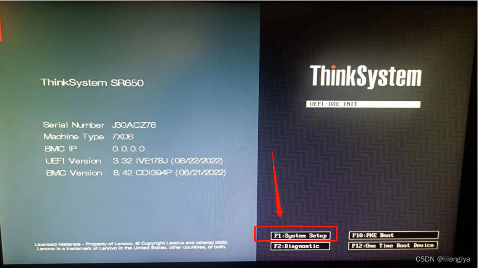 启动服务器,并且按F1进入系统设置(Xclarity是联想的系统管理工具,可以用来装系统)