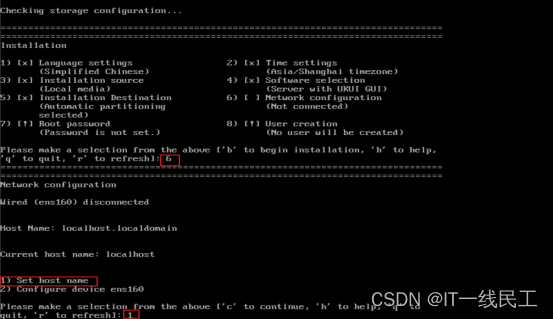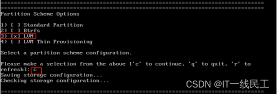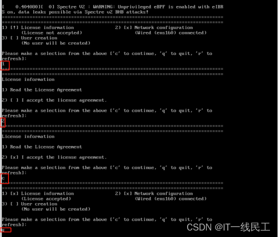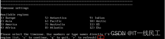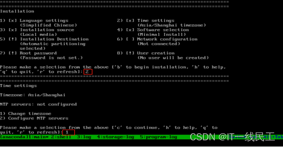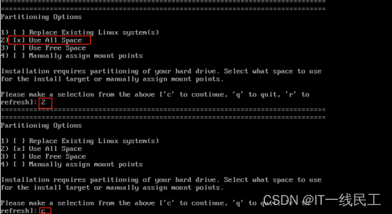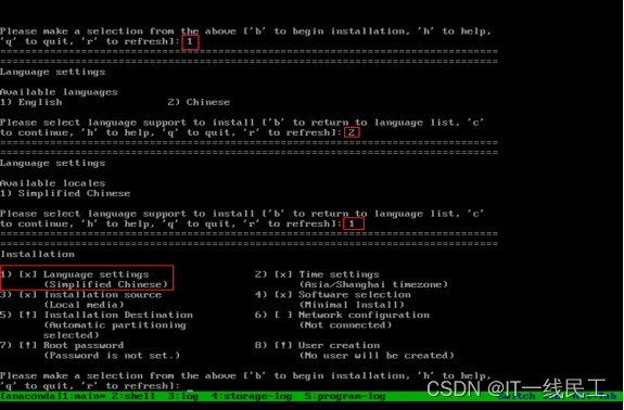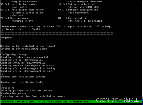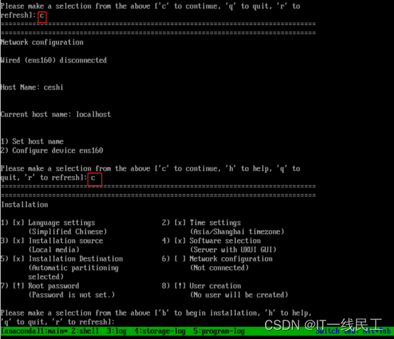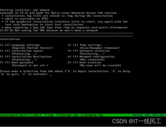1、安装程序将以文本模式启动,您可以按照屏幕上的提示进行操作。您可以选择语言、时区、磁盘分区等。