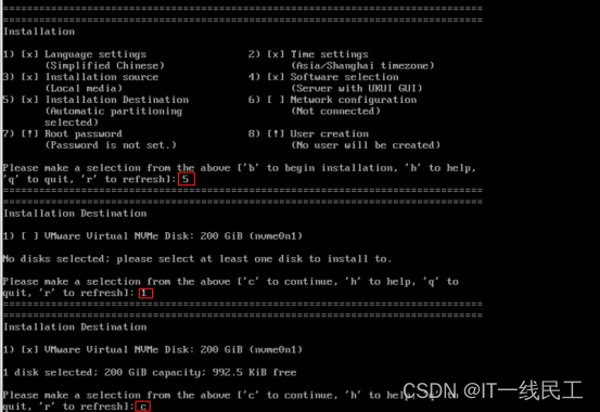 选择5,安装磁盘,然后选择1,200G的硬盘,然后选择c继续