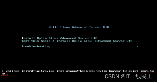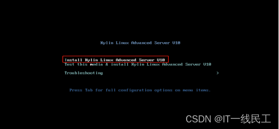 在引导菜单上”install Kylin Linux Advanced Server V10”,按下键盘上的e键,这将允许您编辑引导选项。