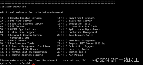 下面是单独选择安装包的的界面,可以不选择,直接按c继续执行,如果选择,直接输入数字回车。