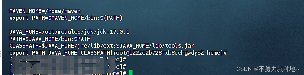 MAVEN_HOME=/home/maven export PATH=$MAVEN_HOME/bin:${PATH} JAVA_HOME=/opt/modules/jdk/jdk-17.0.1 PATH=$JAVA_HOME/bin:$PATH CLASSPATH=$JAVA_HOME/jre/lib/ext:$JAVA_HOME/lib/tools.jar export PATH JAVA_HOME CLASSPATH maven 使用时,如果提示权限问题,输入如下解决: