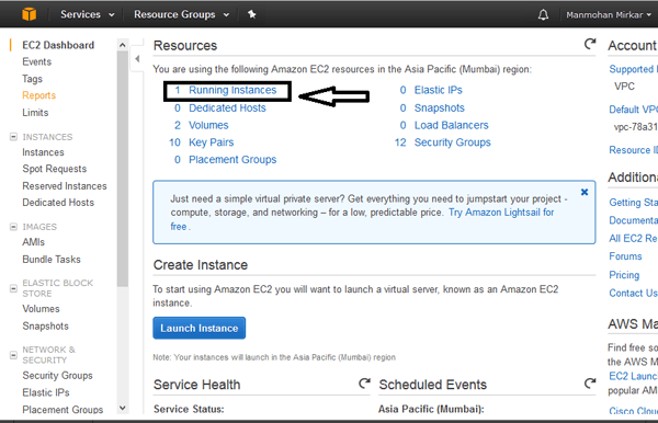 j、 点击“启动实例Launch Instance”按钮后,转到左上角的服务。选择“计算compute”--> “EC2”。现在点击“运行实例Running Instances”: