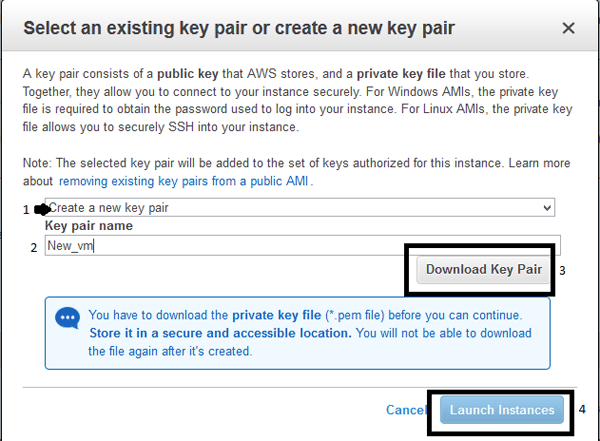 i、 单击“启动Launch”按钮后,系统会像下面那样弹出一个窗口以创建“密钥对”:选择选项“创建密钥对create a new key pair”,并给密钥对起个名字,然后下载下来。在使用 ssh 连接到服务器时,需要此密钥对。***,单击“启动实例Launch Instance”按钮。