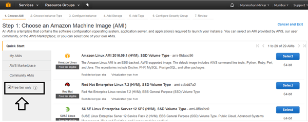 3、 现在,当你使用的是一个 “Free Tier” 帐号,接着***选择 “Free Tier” 单选按钮以便 AWS 可以过滤出可以免费使用的实例。这可以让你不用为使用 AWS 的资源而付费。